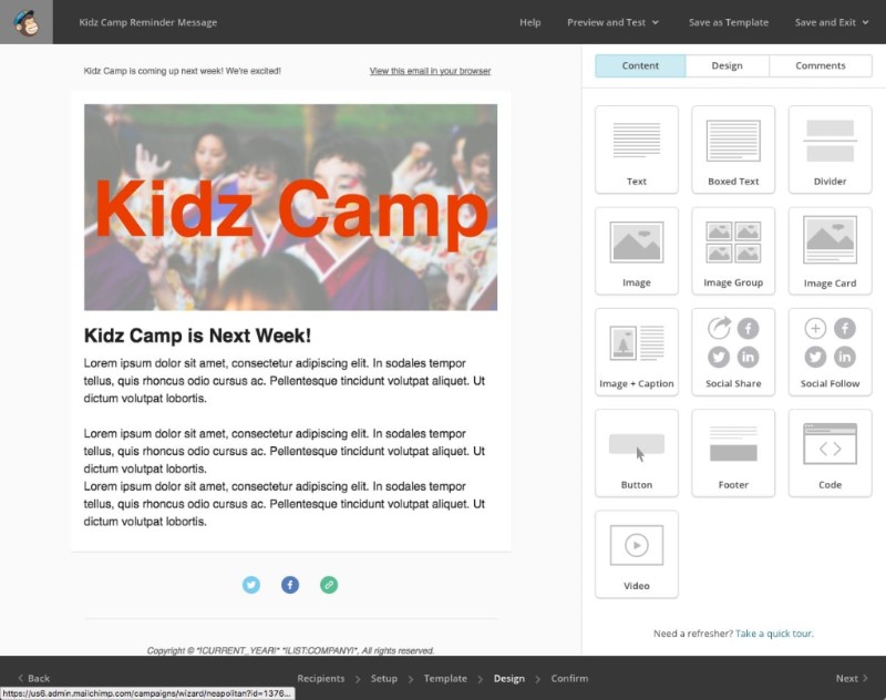 You will then need to create a campaign in MailChimp. Be sure to select the correct group for the particular event. MailChimp’s campaign builder will walk you through the campaign setup quite smoothly.