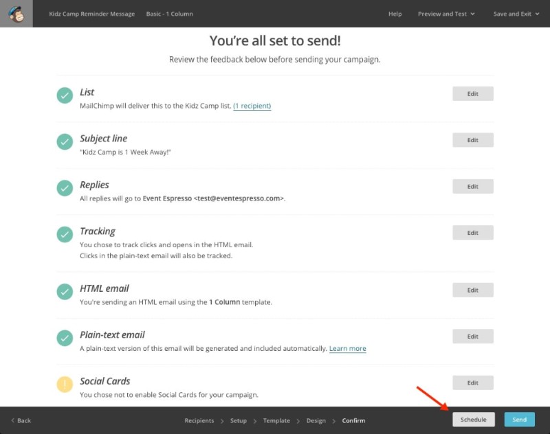 Once you have reached the Confirm step in the campaign builder, and all of the items in the list have been checked off, you want to select Schedule at the bottom.