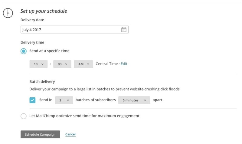 Now, back to the MailChimp dashboard. We are going to schedule a message to be sent one week before the event starts reminding the attendees about the event. Our event begins on July 11, 2017, so we want to send the reminder message on July 4th.
