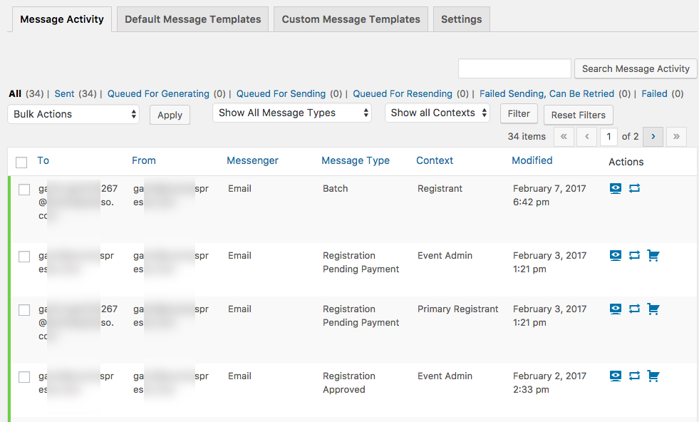 You can view the status of messages, resend messages, and delete messages from the Message Activity list table. You open the Message Activity list table by browsing to Event Espresso > Messages.