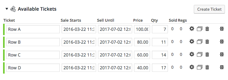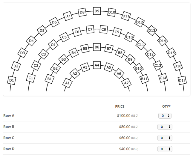 Then you set up the ticket selector to show a ticket type for each row and or section. In this example, we have 4 rows. Each row has its own unique label, price, and quantity. This way people can choose the location that meets their needs at the price they want.