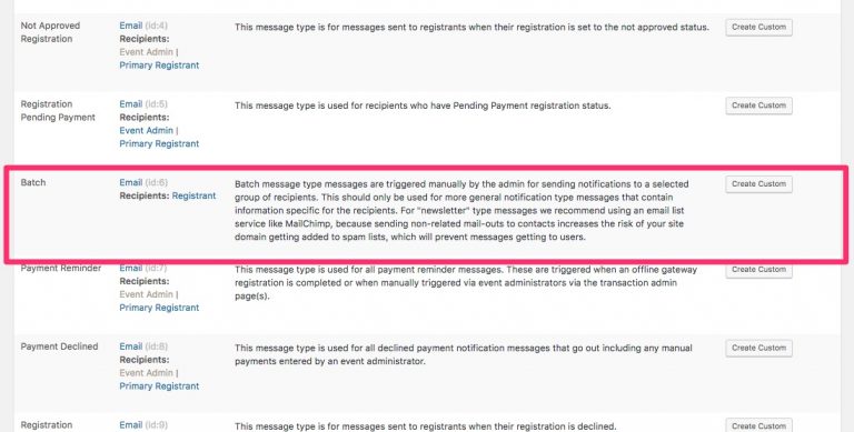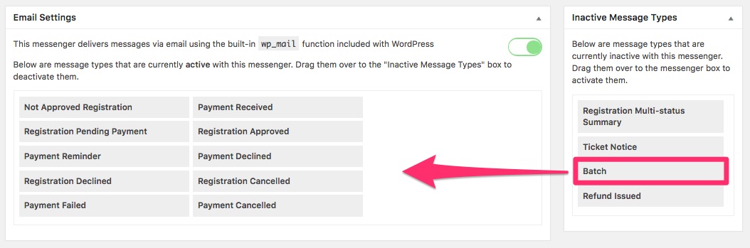 Note: If you have recently updated from an older installation of Event Espresso 4 the Batch message type may need to be activated. You can activate the Batch message type on the settings screen for the Messages system (Event Espresso –> Messages –> Settings). Once on this page, you click and drag the Batch message type and move it to the active box.