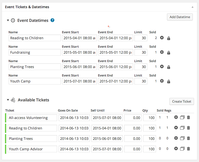- Create a single ticket that has access to each datetime/volunteering opportunity, by adding the following for each ticket: