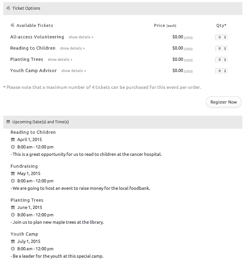 Once you have configured your event registration and ticketing for these similar types of events, your potential customers/attendees/volunteers will be presented with all the volunteering opportunities on ONE page. This is what the front-end would look like (click to enlarge).
