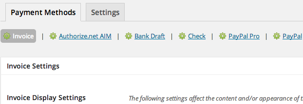 In the above image we see five core payment gateways for Event Espresso: Invoice, Authorize.net AIM, Bank Draft, Check, PayPal Pro, and PayPal. A green gear icon means that this payment gateway is currently activated for Event Espresso. If you see a white gear, this means that this payment gateway for Event Espresso is deactivated and you can activate it by clicking on the name of the payment gateway and then clicking on the green activate button.