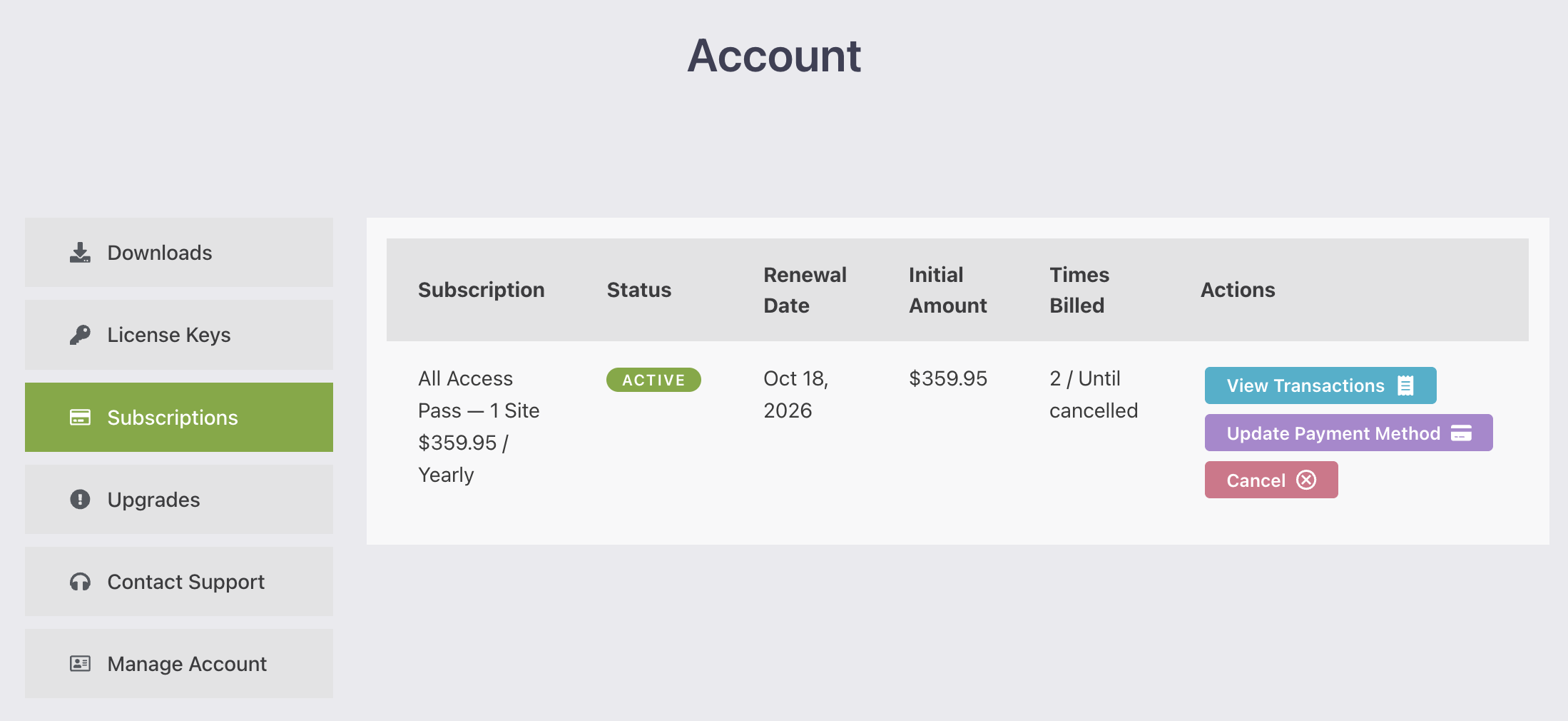 Heads‑up: Your subscription auto‑renewal controls future updates and licenses. Even if it's cancelled, your license remains valid until expiration (typically one year from the purchase date). After that, you’ll no longer receive updates or support.