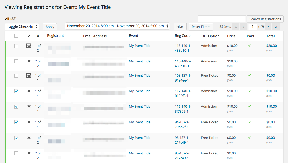 Step 1: You select an event from the drop-down select, then click the Filter button. Now you are viewing a list of registrations for an event.
