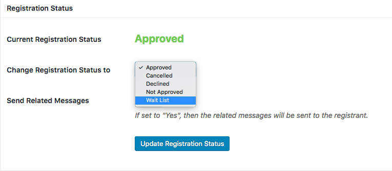 The registration status can be changed from the list table, or also within the Registration details page. There you can cancel a registration, or change its status from Wait List to Pending Payment.