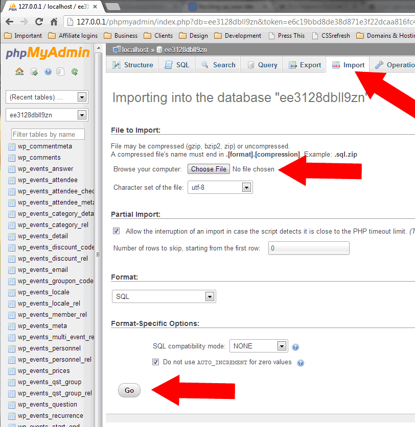 3. On the top menu click “Import”. Under the “File” to Import section click the “Choose File” and select the “SQL” file you previously exported and click “OK”.