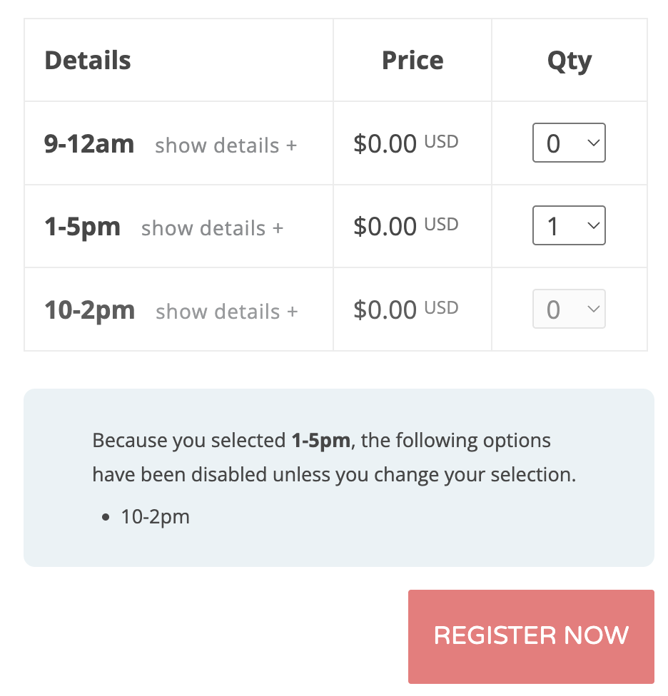 If an attendee selects a ticket for 11:00 AM to 12:00 PM, and another ticket is scheduled for 11:30 AM to 12:30 PM, the second option will be disabled until the attendee removes the first selection.